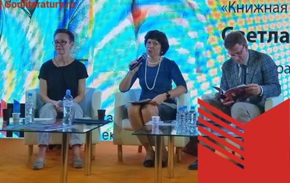 Писательница Гузель Яхина, ведущая Светлана Зорина, генеральный директор издательства "Эксмо" Евгений Капьев.